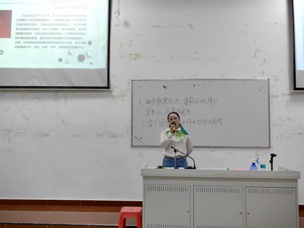 何晋平经理对本次实训项目的模式、特色进行整体介绍:“闯越星”实战营采用“理论基础+实际操作”的模式,依靠闯越人才孵化数字生态平台,为同学们提供网络直播电商产业的真实场景、真实业务开展人才孵化服务,以网络直播真实岗位标准开展实战训练。